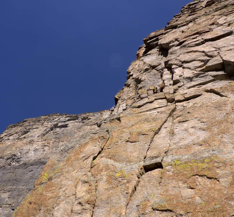 The climbing is great fun, nice cracks with good rests at regular intervals. It's easy to place gear but as with many alpine-type climbs you have to be careful about rope drag.