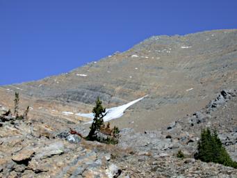 We got a good night's rest and a liesurely start. As we were getting ready to leave camp, two guys came hiking up, headed the same way. They were in high gear... We scrambled up to a bench along the bottom of the east face and followed it over towards Icefloe Lake, then contoured around Icefloe and up towards the Ashley Creek divide. From there we could see the south face. We hid behind some rocks in the sun to warm up and grab a bite to eat, and planned our route up. As we watched, we could see the two guys who went by us in camp as they approached the summit. I don't think either of them did much more than stomp on it, then turned around and headed back down. They passed us just as we were starting up.