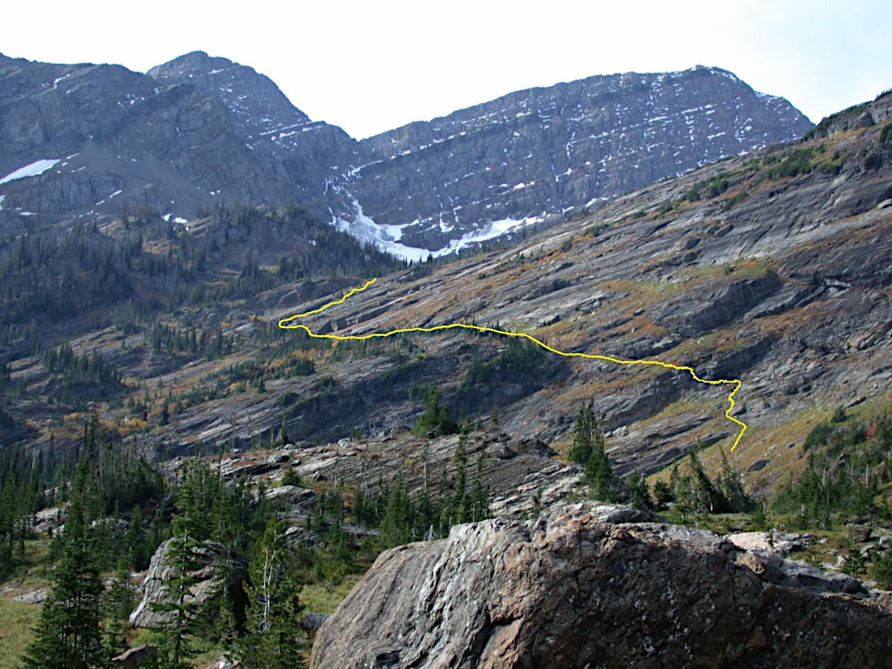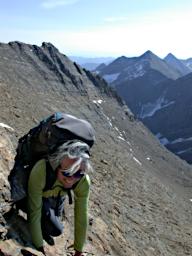 Our route went up to the snowfield in the middle of the face, across some yellow ledges which we nicknamed the "Yellow Brick Road", up a scree slope to a small horizontal snow patch, across to the west ridge, and then up to the summit. From the west ridge you have a great view of West McDonald, and the knife-edge ridge connecting it to McDonald.