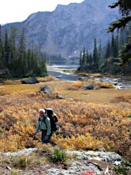 We hiked up to Island Lake using the old trail, dropping down to the lake from the ridge above Turquoise Lake. Then we followed a well beaten path to the top of the ridge dividing the Swan Valley from the Flathead Valley. From the divide you have a great view of Crescent, Heart, and Island Lakes. Betsy pointed way up one of the ridges where the larches were blazing yellow and told me that was where Circle Lake was, apparently a fun place to go if you like grueling hikes.
