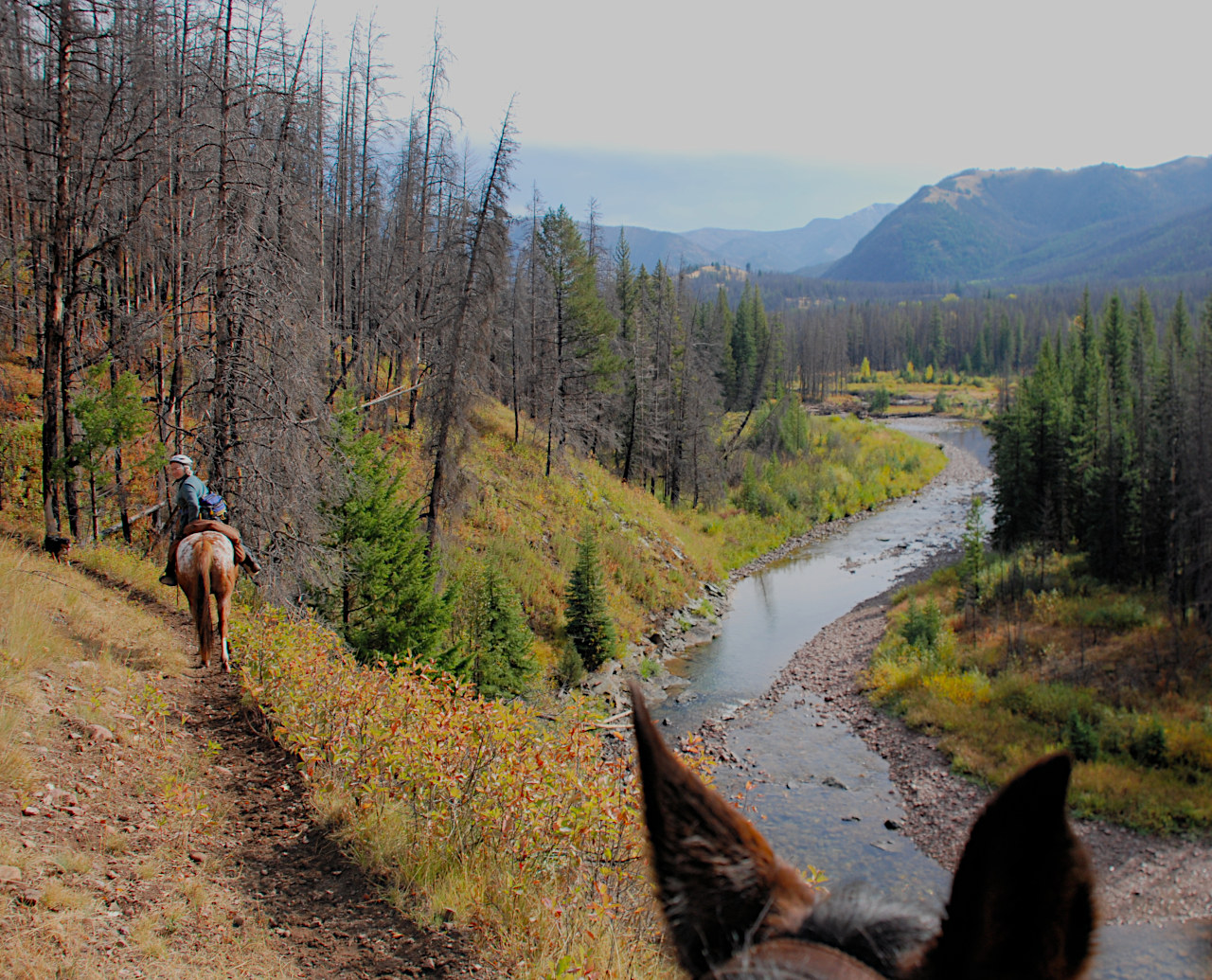 It rained a bit overnight; by morning the weather looked iffy. By lunchtime at the confluence with the South Fork it started clearing. We had a fine afternoon riding and hiking through Pretty Prairie.