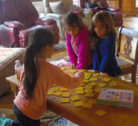 At home we have matching games we play with the kids using images of local birds, mammals, reptiles, and flowers. But they are pretty specific to where we live, so we brought a commercial bugs and butterflies of the United States game to play with the grandkids. When we play we make everyone say the name of each card when they turn it up, and that way they end up learning the animals and flowers. Elizabeth, Aviana and Amelia took to it right away.