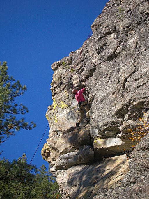 We finished up doing a route whose name I haven't been able to figure out. Apparently Rick Torre's 1996 Bitterroot Climber's Guide Book calls it Spider Hang, but Spider Hang is the 5.10 splitter crack in the huge roof between Web's Edge and Spider Scense. This climb is a 5.10 just downhill (right) from Spider Scense. Given the incorrect "assumed name," I'm going to call it Wanna-be Spider Hang, at least until someone can show / give me an actual handle for it. It has a difficult to protect 5.10 start so we top-ropped it. According to the topo in Torre's book there is a 5.8 start to the left of where we went up. Tim had to give me an assist getting off the ground; everyone else made it with varying degrees of finesse.