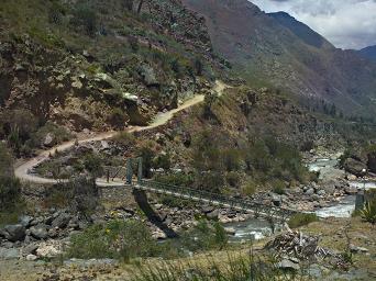 The trail to the drawbridge winds around out of sight, clinging to the side of a steep mountain. If it were the only access to Machu Picchu, the place would have been impenetrable, but unfortunately, it is not the only access. The trail is carved out along a ledge in places, and in other places it sits atop a carefully constructed wall built out from the cliffs.