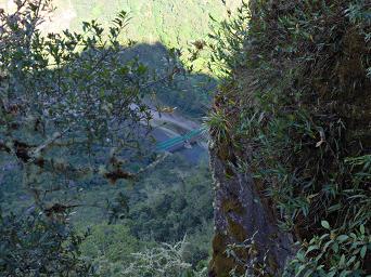 The drawbridge itself is simple — four small logs spanning a big gap. But what a gap it is! The Inca made superb use of the terrain. The trail is built up along a sheer cliff wall, with a steep climb along the wall leading from the bridge to the city. One could lose a lot of soldiers trying to assault the city from this direction.