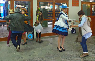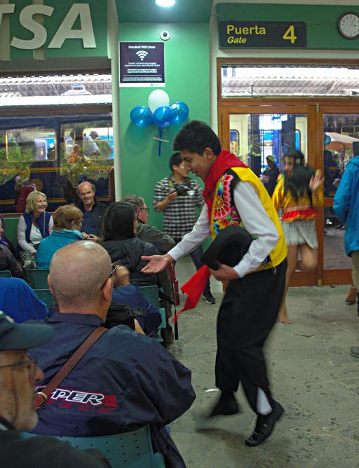 When the time came, we retrieved our bags and headed for the train station for the trip back to Cusco. It started to pour rain and everyone (including us) scrambled from the outdoor restaurant into the station. While there some local dancers showed up and encouraged everyone to join in.