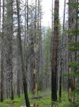 While there have been quite a few forest fires in this area the past few years, most of the trail was still in virgin timber. There were a few places where a lot of trees had their tops broken off from heavy snowfall. They generally don't break when the snow is weighing them down -- instead, they snap off when the snow all falls off at once and the tree springs back upright.