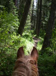 The creeks were all running more or less bank full, and spilling out into the trail in places. Fortunately, there were nice pack bridges in places. But other places didn't have much. It wasn't a big deal except we were on a steep hillside and if anything was soft we would be in for some excitement. That only happened once, when the trail caved a little under Daiquiri's left hind foot. I was a bit nervous for a while after that...