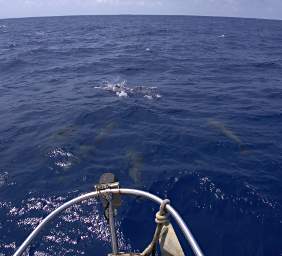 I came about and headed back; it was a fast trip. Along the way a small group of dolphins came by to say hello. I always get a kick out of watching them make fun of my slow progress as they race back and forth, weaving just out of reach at the bow.