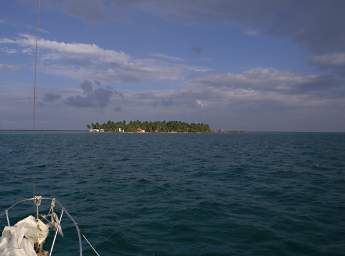 The next day I headed out at 06:45 for Glover's Atoll. The wind was... surprise ... on our nose. It took two tacks to get out the reef cut, and I couldn't lay a direct course for the entrance at the southeast end of Glovers. As we got further out, the wind and waves were building, so I put in a reef on the main. It was fine sailing, but by 11:00 I was still 5 mi off and fighting 6' seas. The seas were most likely the result of being clear of the protection of the atoll, and were waves traveling from much further east. I started thinking about the anchorage and how I'd spent three days there a few years back in a lot of wind and decided there wasn't much point -- the diving would be restricted if I went up to Off the Wall at Long Cay, and my head just wasn't in the right place.