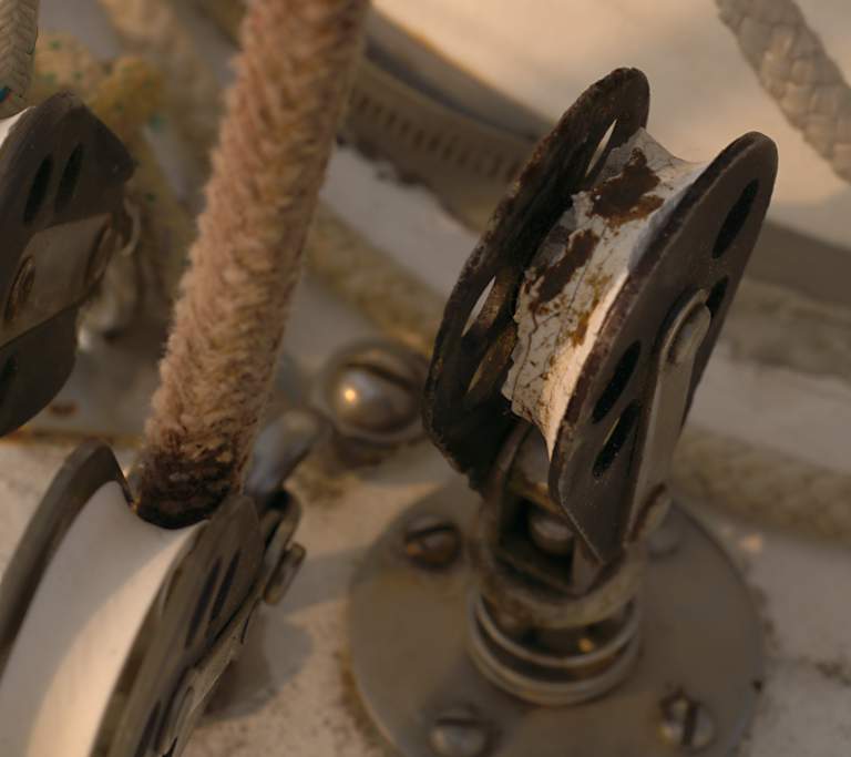 I discovered the sheave on one of the turning blocks at the base of the mast was shattered, so I found a new one among my spares and put it on. Modern plastics may be great, but they don't last forever. I always think they should; this one was probably 35 years old...