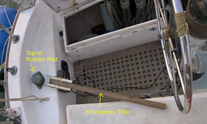 Somewhere in there in the middle of the dark night it registered on me that the steering was getting loose. Sure enough, it gave out shortly afterwards. I grabbed the emergency tiller; I couldn't find my headlamnp so grabbed a flashlight. But I only have two hands, and my mouth wasn't big enough to hold the flashlight. I had a heck of a time getting the emergency tiller on the rudder post; fortunately the boat was hove to so we weren't bounching and crashing all over.