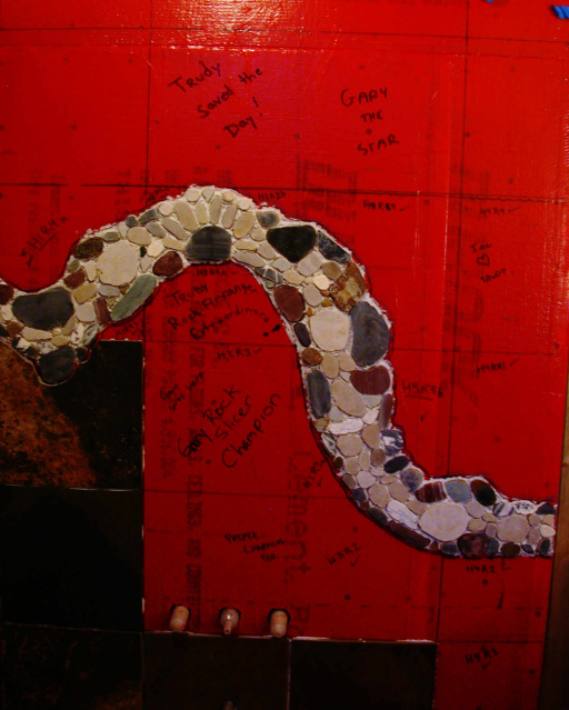 I spent the next few days slicing rocks, while Trudy prospected for more rocks and started composing the river by placing them on the paper template. Eventually, we had enough rock, and finished the composition.