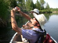 Trudy and Ian have always enjoyed canoe trips, and this July during their visit it was hot. So we took a couple of canoe trips down the Big Blackfoot. No big white-water; just the three of us and Indy in my old beater. The river is pretty crooked where it winds through the valley between where it exits the canyon below Lincoln and where it enters the next canyon. It winds through ranches where the river bottom is full of wildlife. We saw a lot of bald eagles and herons, some elk, along with ducks, geese, sandhill cranes, muskrat, and cows...