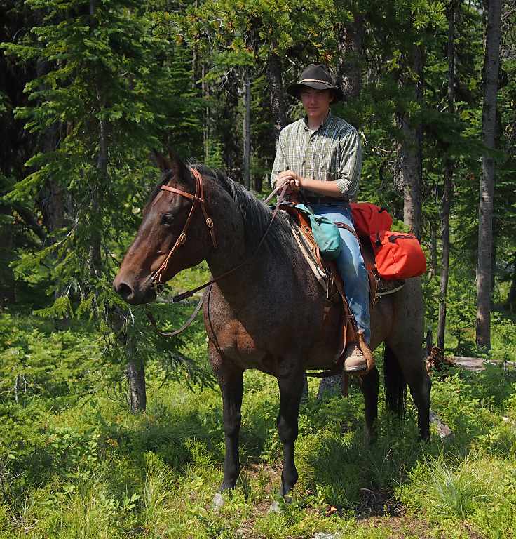 The first four miles was all uphill, but everyone made it in good shape. Dona rode Sky, Zia rode Ashe, Adin led Lacy with soft panniers thrown over a saddle, and I rode Sambo and led Scheba with the bear-resistent panniers and Poppie with some soft panniers thrown over her saddle.