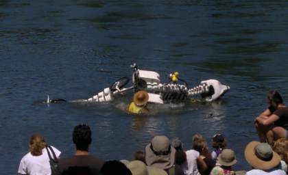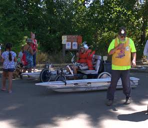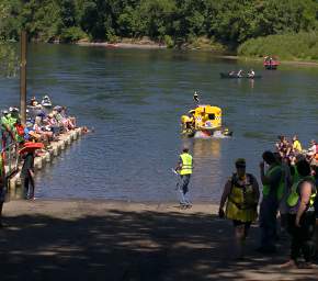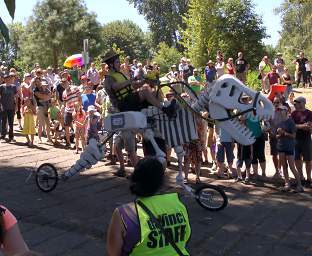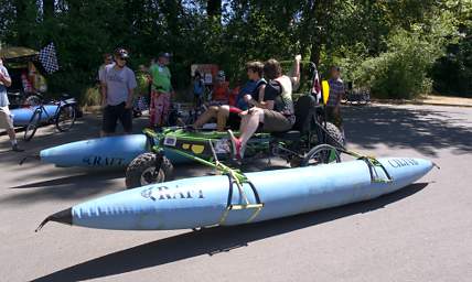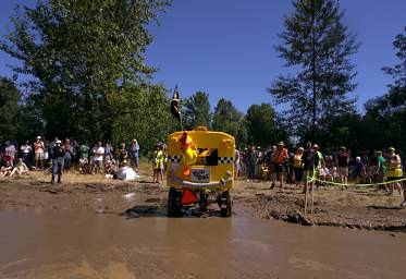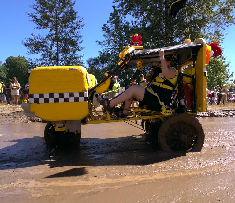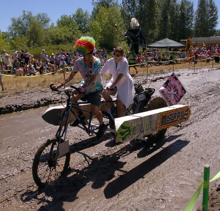 "Racers must ride over 10 miles of city streets, over a man-made sand dune, across 3000 feet of sun-dried, clay pasture, through 200 feet of deep, thick, sticky mud, and down 2 miles of the Willamette River. All of this under pedal power with no help from their friends (or spectators)!"