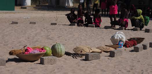 The festival was a competition, with groups from schools around our area. There were different classes for primary and secondary schools. Each group had at least one drummer and a set of dancers, which were mostly girls but some groups included some boys. The group entered to the beating of the drum, singing, and sometimes a high-pitched rapidly undulating "li-li-li-li-li-li" like sound. I don't know what the significance of that sound is, but if I were a German or South African occupier during wartime it would be unsettling to hear. They carried baskets with various things in them, mostly grains and fruit, which were set out before the audience. They then commenced a kind of dance, where one to four individuals came out and stomped in super-fast time to the rhythm of the drum and clapping by the rest of the group, then traded out with the next few individuals.