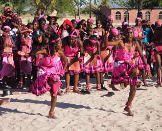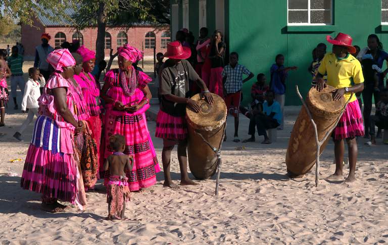 Some performers had springbok skins hung from their belts, also dyed pink. I'm not sure what that represented, if anything; the skins are a normal part of the traditional costume of the Ovambo people.