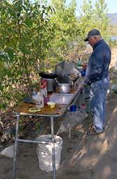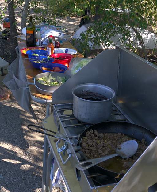 I was on for breakfast on day three. I had a simple granola and yogurt planned, but with a treat of cinnamon rolls. I made the dough up after dinner and watched it not rise. I think I got mom's recipe wrong, because it says to mix up the dough and then let it rise overnight in the fridge. That doesn't make sense, as it needs to be warm to ferment. I think you're supposed to let it rise, then store it in the fridge overnight. Anyhoo, I rolled it out, using my arm as a rolling pin. spread cinnamon and sugar liberally all over, sprinkled on a boatload of raisins, rolled it up, cut it into rolls, and filled the dutch oven with them. I stuck them in one of the coolers to rise some more overnight. In the morning I started some charcoal and sat the dutch oven near the charcoal to try and coax them into rising at least a little. When the charcoal was ready, I put nine briquettes on top and six on the bottom; I don't think that was quite enough but it's all I had started so it would have to do. It seemed like they were never going to get done, but when we finally opened them up to eat they were perfect. Wow! A real treat, I was pretty proud. They disappeared in an instant. Yum!