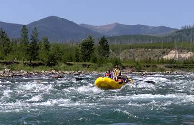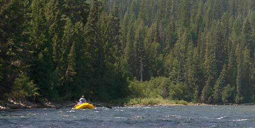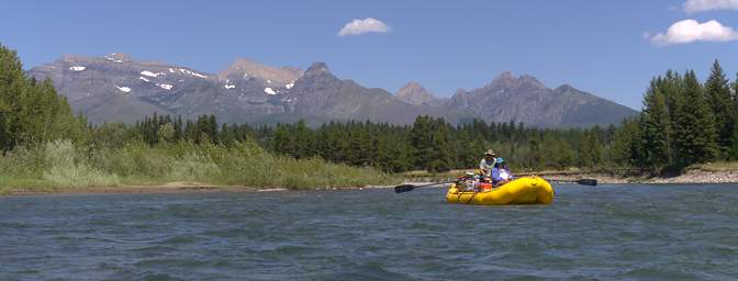 Steve and Diana drove up from Colorado, and after an overnight at our place we threw my gear into their raft and headed north.; We spent the night in the San-Suz-Ed RV Park and Campground near Apgar in Glacier, as Apgar was full. The campground itself was fine, but it is close to the highway and the train tracks so it's pretty noisy. It was a hot night — I never zipped up my sleeping bag. In the morning we picked up our shuttle drivers from Glacier Raft Co. and headed for the put-in at the Canadian border.