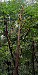 I had indicated I wanted to go back to the Masked Bowerbird bower after lunch, since Mehd had seen a bird there. I was hoping maybe the weather would improve and it would return. But Zeth had another bower where he had seen some so he sent me off with his apprentice / understudy and a couple of helpers. The trail was not the best — muddy and narrow, up and down, slippery log crossings, and often at a slant. We took off at a good clip; I was pretty much totally occupied keeping up, and didn't spend time looking around for much of anything of interest. I think these guys were used to zooming through the woods and not wandering slowly to see what might be around. They were definitely not used to leading old slow westerners through the forest! So a little more training in that regard is needed, as is some training on ambling along to see what you can see. But maybe we needed to be in a hurry to maximize our chances of seeing a bowerbird. In any case, we arrived at the bower, plopped down, and sat and watched. And sat and watched. And sat and watched. For about two hours. To no avail. Pooey!