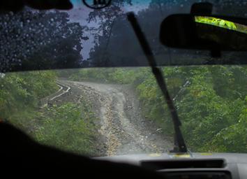 It was 18:30 by the time we all got out to the road. Then it turned out we didn't have an actual vehicle pick-up arranged; we were going to hitch-hike. Zeth's village was about an hour's drive further up the bad road up the mountain. Unfortunately, most of the vehicles were coming down the mountain, and the few going up were stuffed full. No-one was making a very energized effort to get any of the vehicles, especially those going down the mountain, to stop. It was starting to get dark. Some of our porters built a fire to keep warm.
