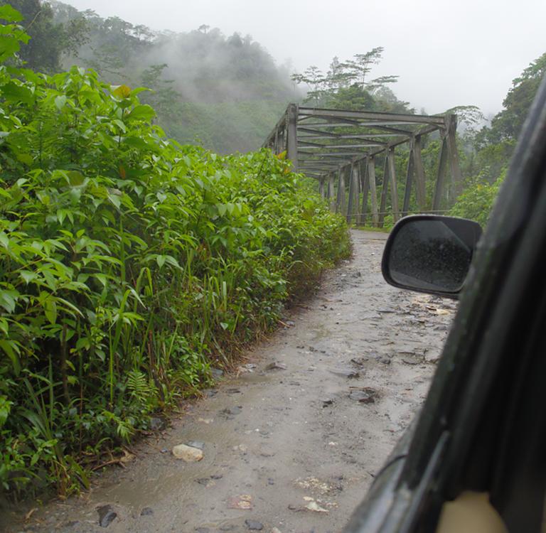 As we headed into the mountains, the weather deteriorated. Our driver pulled off and stopped to get out another tarp. He wanted to rig something so the people riding in back didn't get soaked. The truck didn't have tie-down points towards the cab, at least not on the outside, so he just opened the door, tucked the tarp in, and closed it. It seemed to work pretty well.