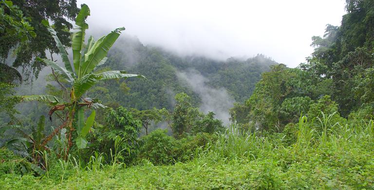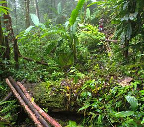 We started by hiking a ways further up the road. When we came to where it looked like a trail headed off into the rainforest, we stopped and waited for Mehd and Zeth who were finalizing arrangements with our porters. There were a few cows grazing nearby; I was surprised to see cattle in a place where there was virtually no grass and nothing but dense forest. Ram loosened up, and we enjoyed a rare bit of sunshine. It was the last we would see for a while.