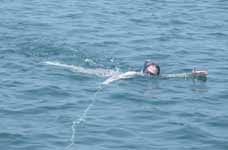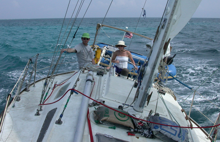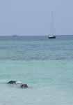We had light winds as we headed south from Belize City. Mel couldn't wait to get wet, but she was all worried about something from the deep getting her. After all, "You can't see the bottom!" This from a girl who used to swim competitively, and still likes to coach. I assured her the sharks were friendly, and any other big critters would only nibble on her toes in a friendly sort of manner. Besides, you could see the bottom, here and there, twenty feet below us. The water got clearer as we left Belize City and the mainland farther behind. We tied a line off behind the boat, and with some apprehension, she finally jumped in. That was the end of her concerns. She raced us, and won for quite a while. But after a while the wind picked up a bit, and three knots was more than she could handle. I was impressed.