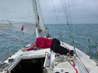 Most days the wind was light, and we could laze around while we sailed. The puffy bag with the blue rings on the deck in the photo of Mel is a sun shower. Not the best place to put it, but hey, this is a small boat, and there's no such thing as a good place for it when under way, if you want it to be heating up.