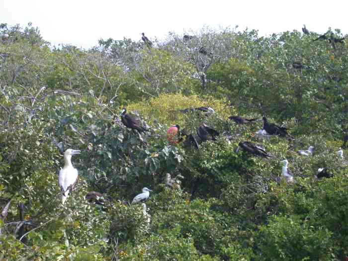 The Gumbo Limbo trees are full of Frigate Birds and Booby Birds. Frigate birds have up to a seven foot wingspan. They fly well, but don't dive well and cannot land (and take off!) on water. So they harass other birds, like the Boobies, and try to rob them of whatever food they have. This happens in mid-air, and is interesting to watch. Apparently they also will rob the nests of both eggs and young.