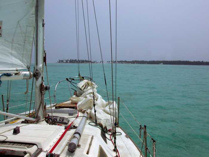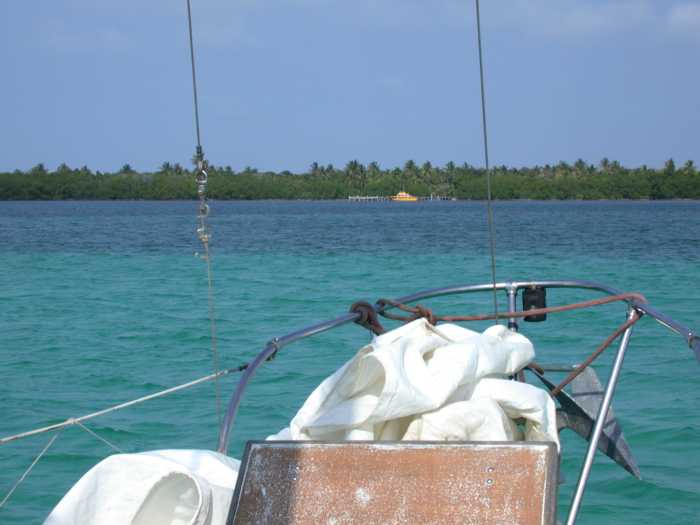 As I went through the cut, the wind changed, so I doused the chute and put the main and #2 back up. I edged by Buzzard Shoals, where a half-dozen small Belizian fishing boats were anchored in about twenty feet of water in what seemed like the middle of nowhere. I was a hundred yards north, in 150 feet of water.