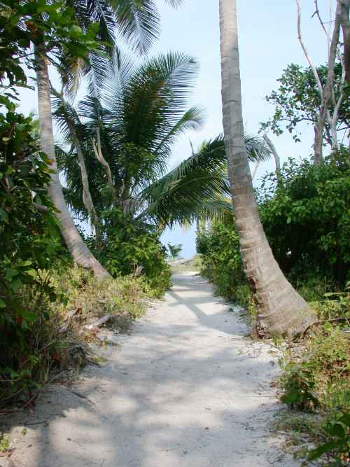 The next morning I headed out early, intending to sail to Lighthouse Reef, another of Belize's offshore atolls. As I sailed out in a stiff breeze, I noticed the prop shaft was rattling. I put the engine in gear (without the engine running) to stop the shaft turning, but it continued to spin. Damn! The shaft was loose from the drive saver / transmission, again. I turned the helm over to Auto, emptied the cockpit locker, and stuck a pipe wrench on it to keep it from turning. I decided the sea gods were telling me I wasn't quite ready to leave Turneffe. I continued south for a mile or two to a cut I had noticed on the way up, a cut which wasn't marked on my chart. I anchored just outside it, then spent an hour reconnecting the shaft. In the process, I discovered I con't have spare bolts for it. Ouch! Something to get next time I'm ashore. I also discovered the value of a Woodruff key over a long square key. A woodruff key is half-moon shaped, and sits in a half moon shaped hold machined out of the shaft. The depression is more expensive to make, as is the key itself. But the shaft can't slip out the way it can with a square key in a square slot cut all the way into the shaft from the end.