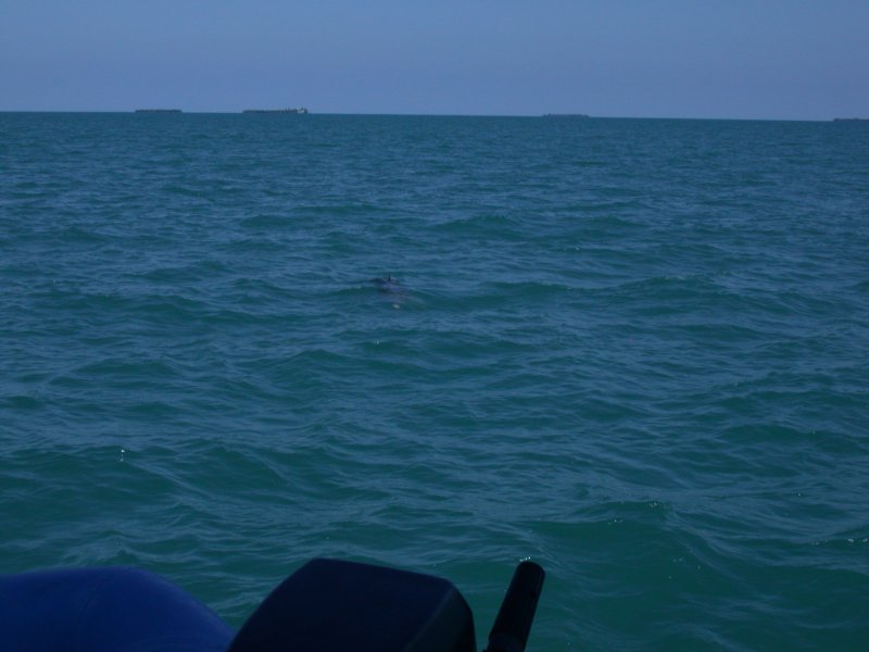 As I was heading for Placencia, a lone dolphin showed up and stayed with me for quite a while, until I was almost in the mangroves of the ship channel to Big Creek. Every time he surfaced I blew the conch horn at him, hoping it would make low undertones he could hear.