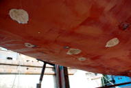 We repaired the rudder and patched a crack at the point where the keel joins the hull. I don't know whether that one will hold or not; it seems like an inherent weak point which will flex under any conditions and probably can't easily be kept closed.