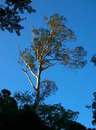 Most of the Tabin Wildlife Reserve is recovering jungle; recovering because it has been previously logged, and is secondary forest. There is a small core area of unlogged terrain in the middle of the reserve. The Tabin Wildlife Resort is located in the secondary forest in the southwest part of the reserve. As we got closer to the resort, we were traveling down a dirt road with oil-palm plantation on one side and secondary jungle regenerating on the other. It was a pretty dramatic difference. Occasionally we would come upon a huge tree two or three times taller than anything in the regenerating forest; it would always be one of the "trash" trees left during logging operations because it was commercially useless. The tree, a Tualang or Mengaris , was not taken for timber because it is hollow. It can grow up to 80m (~250 ft) tall and has a very smooth lower trunk with few branches. Sometimes there are honey combs in its upper branches, but none of the large mammals can get up there to eat it! I kept trying imagine the whole forest having trees poking up which were that tall. Wow! What a place for a tree house!