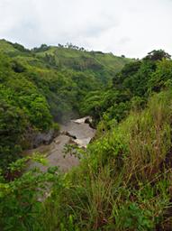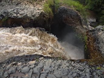 The natural bridge and waterfall is on the Kiwira River, located inside the Kiwira Prisons Training College grounds. The falls, "Cooking Pot" or "Kijungu" Falls, drops through a small arch into a pool. Apparently, somewhere in the bottom of the pool is a hole where the water goes underground. It then erupts back at the surface ten or so meters away. The whole thing is pretty impressive. Kijungu means Cooking Pot in the local dialect, and refers to the shape of the pool where the water disappears underground. One source says the water takes seven days to return to the surface. I find that a bit hard to believe given how close the return flow is to the pool where it disappears; I could find no authoritative research to back up this claim.