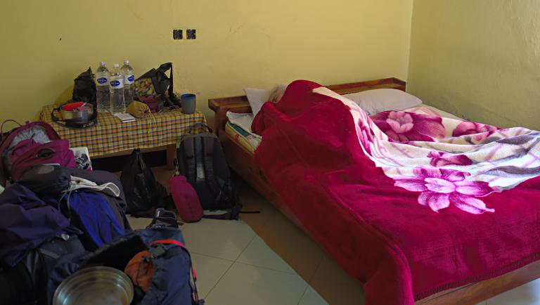 Our room was spare, with a bed and table. We had our own squat toilet and a sink; the sink had a non-functional drain. To flush the toilet, you poured water down it from a bucket. All adequate for our needs, and given the wet weather more comfortable than our tent would have been. The rooms face an inner courtyard containing a bottle-brush tree and the laundry line.