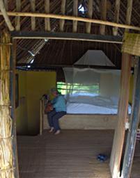 We were heading for a place called Hondo-Hondo, a.k.a. "Udzungwa Forest Tented Camp", which had been recommended to us by a couple from the U.K. we met in Morogoro. After a lot of pot-holed, alternating rocky and muddy road we found the turn-off. As on other occasions, we had originally planned to stay in our own tent but given the frequent rains we decided to opt for more spacious accommodations. We had Godfrey, the manager, show us their "bandas", which are concrete or concrete-block walled cabins with separate outside shower and toilet facilities. We also had him show us their "tented camps" which are really spiffy. We would have liked to stay in one of the tents — they have en-suite shower and toilet and are generally much nicer, overlooking a small (dry at the time we looked at them) creek. But they were $104 each, pretty pricey compared to Simbawenni in Morogoro. So we opted for a banda. Our banda was nicely finished with a texture that is somewhat adobe-like. It was quite spacious inside, but unfortunately, like most visitor facilities the world over, lack much in the way of hooks to hang things on or convenient attachment points for things like clothes-lines.